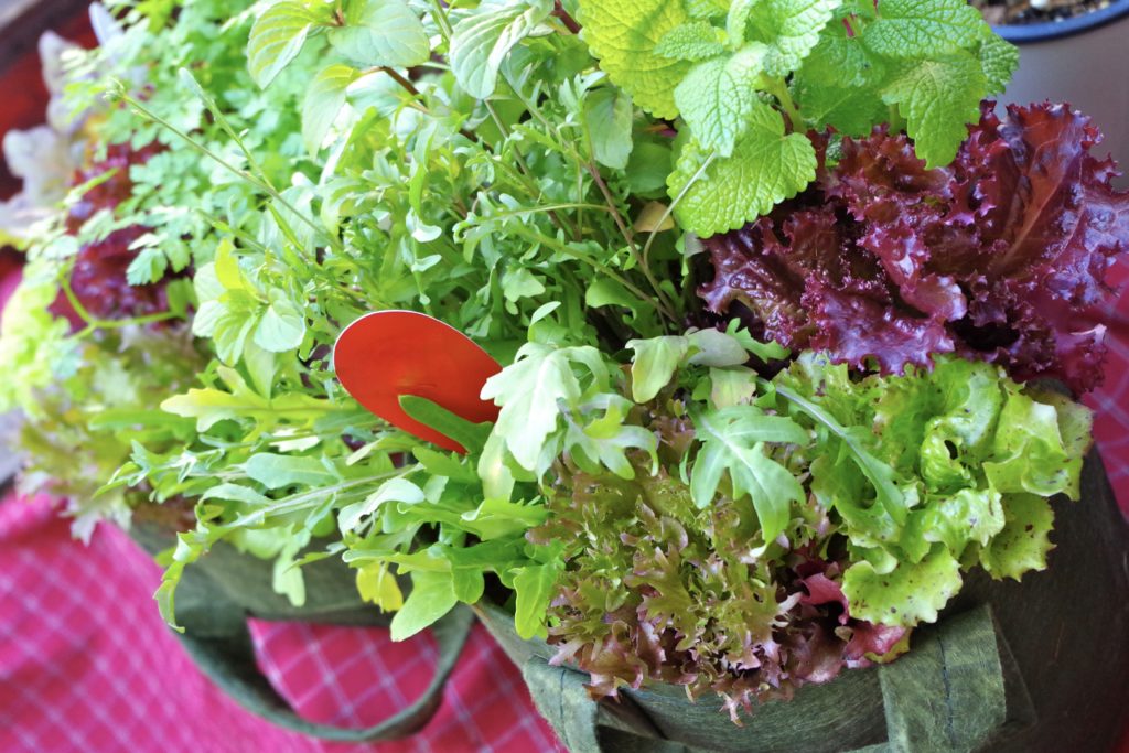 用土+アク抜きベラボン®︎(ヤシの実チップ) をミックスして2017年5月から葉物野菜やハーブを寄せ植えして栽培スタート!