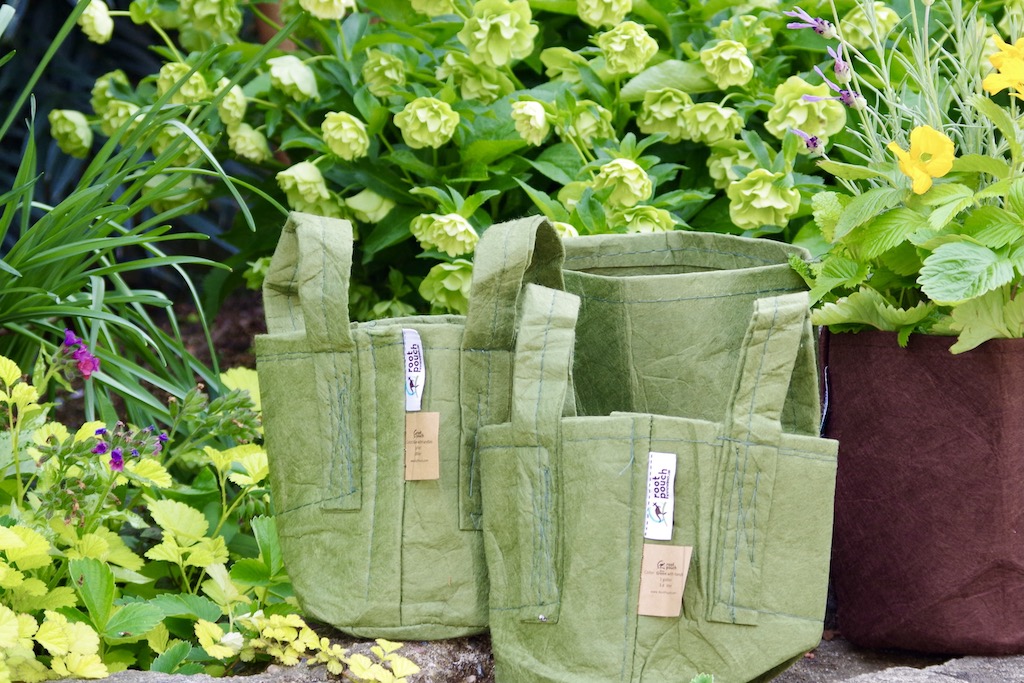 ルーツポーチは不織布製の植木鉢。リサイクルペットボトルとリサイクル天然素材をミックスして作られているそうです。色によって「生分解性」と「非分解性」の2タイプの素材に別れています。 (黒とグレーが生分解性タイプ)
